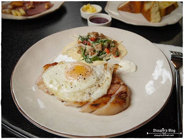 嫩煎豬排與太陽蛋 辣炒時蔬與奶油醬